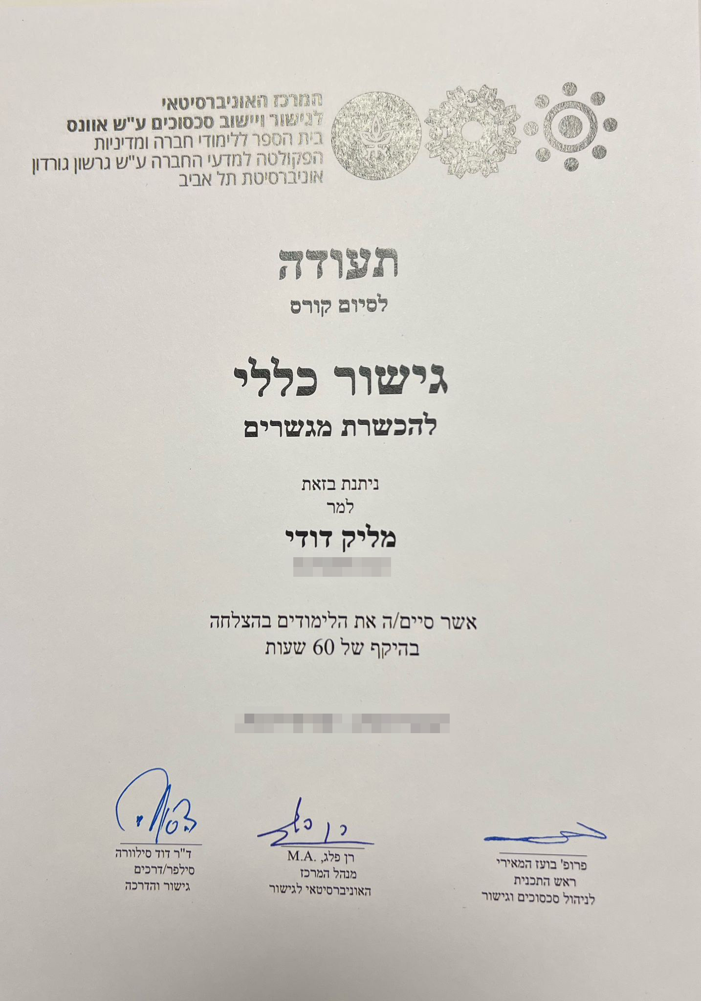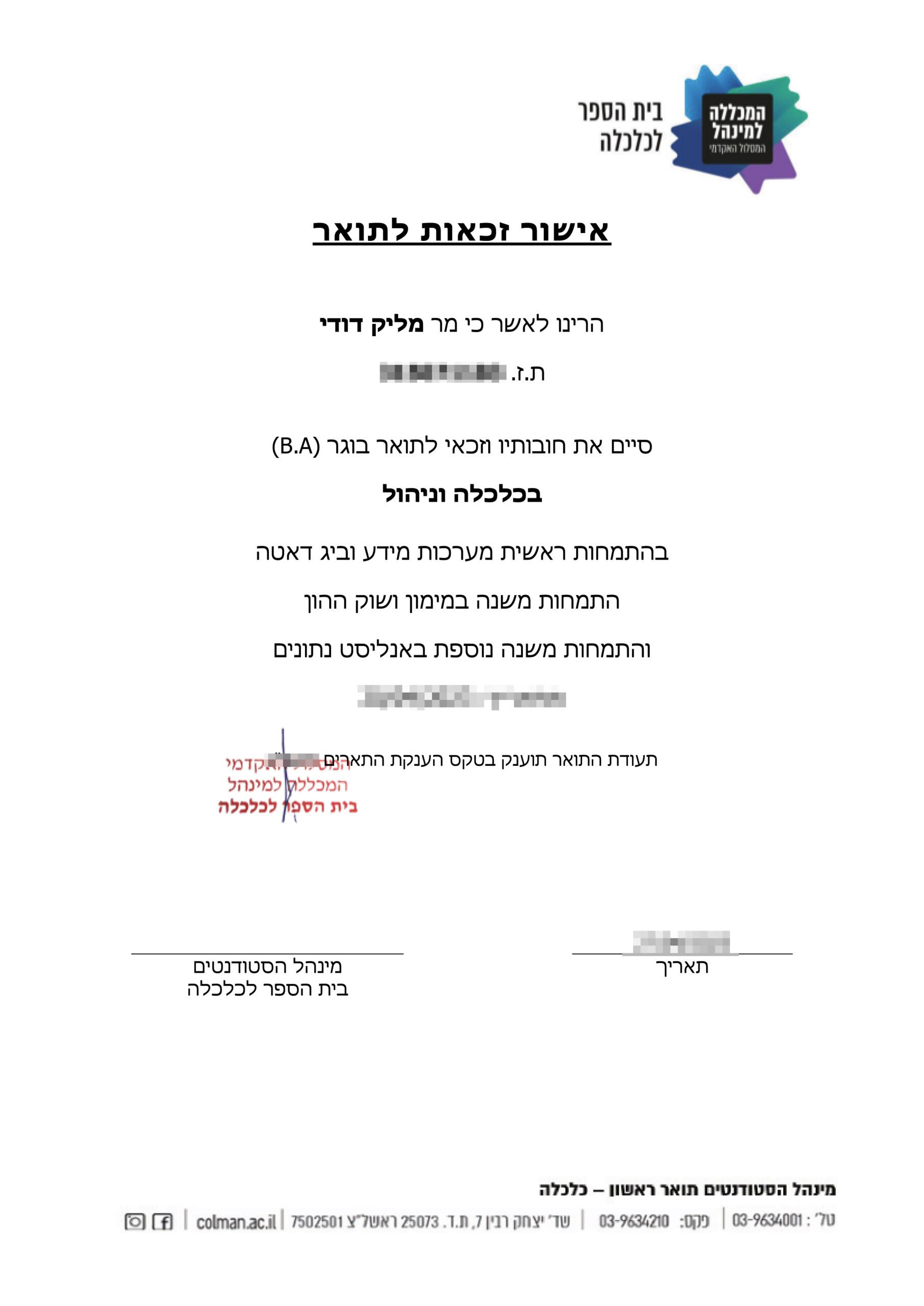 יש לי תואר בכלכלה וניהול עם התמחות באנליסט נתונים, שוק ההון ומימון. תעודת כלכלן פרקטי מאוניברסיטת בר אילן, והסמכה בגישור וניהול סכסוכים מאוניברסיטת תל אביב.